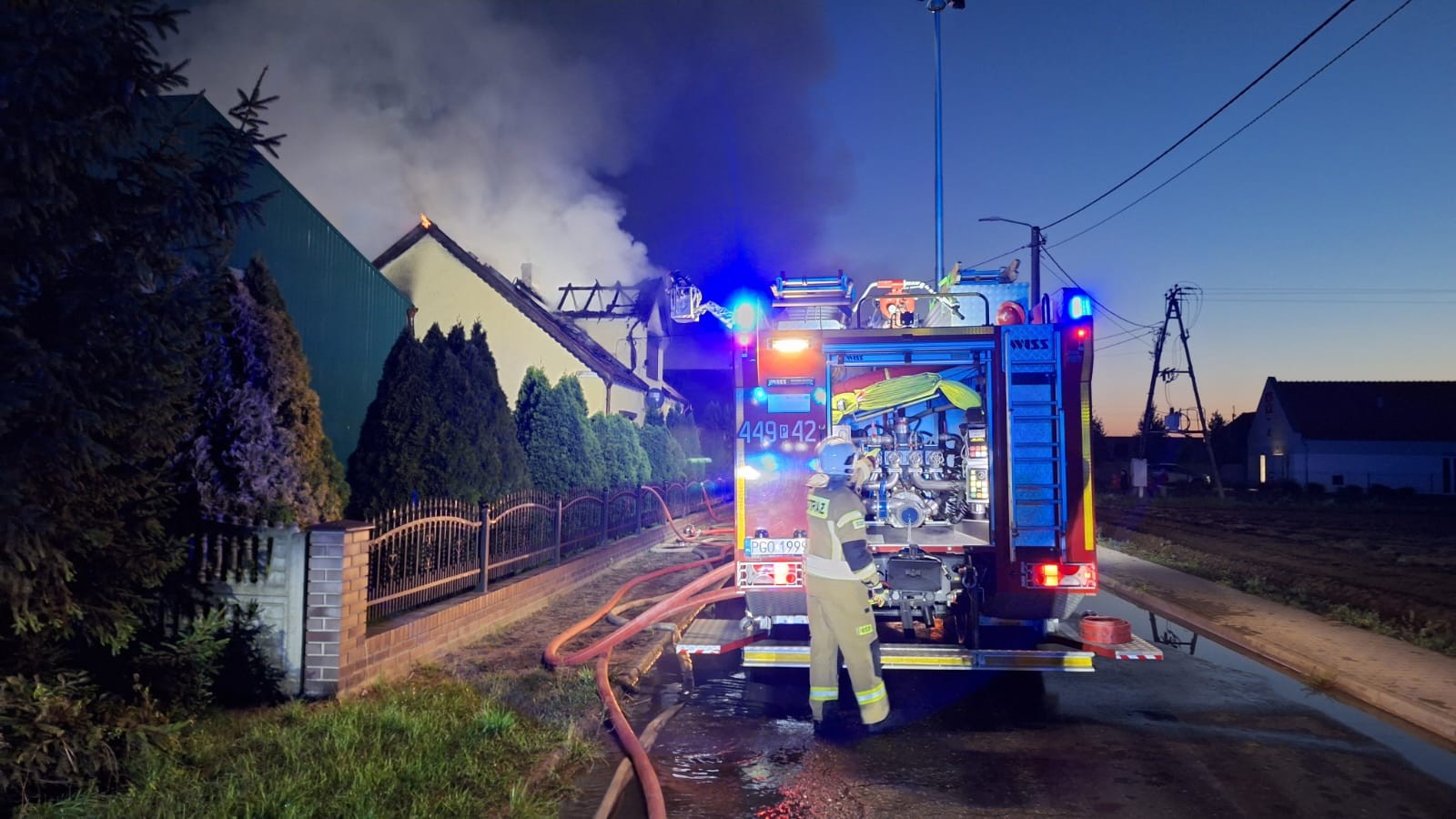 w domu jednorodzinnym. Pożar szybko objął poddasze i dach budynku.